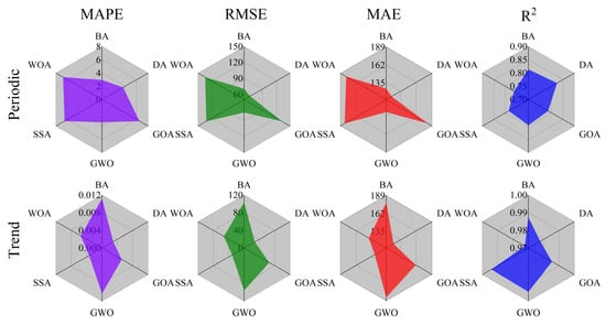 An MSI-based SVR prediction model was developed with the optimized input factors to predict the periodic displacements and the trend displacements separately, as shown in Figure 15. The prediction accuracy and error of each model are shown and compared in Figure 16. For the periodic displacements, the prediction accuracy with the largest R2 and smallest MAPE, RMSE, and MAE was obtained using the DA algorithm among all of the given models. The corresponding result of MAPE, RMSE, MAE, and R2 is 3.654173, 63.0435, 119.2786, 0.824217, respectively. Meanwhile, the GWO-based SVR model gave the best prediction for the trend displacements compared to the other optimization algorithms, with the result of MAPE, RMSE, MAE, and R2 being 0.010273, 95.9178, 184.4194, and 0.99473, respectively. Overall, the prediction results provided by the SVR model optimized by MSI matched well with the observation results.