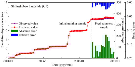 The predicted cumulative displacements of the Shiliushubao landslide can be obtained by adding the predicted periodic and trend displacements. The predicted cumulative displacements are shown in Figure 17, and these are in good agreement with the observed displacements. The maximum relative error of monthly displacement is generally less than 3% and the average relative error of less than 1%. The results show the usefulness of the proposed model. The most appropriate optimization algorithm and the most relevant landslide related factors were selected and applied.