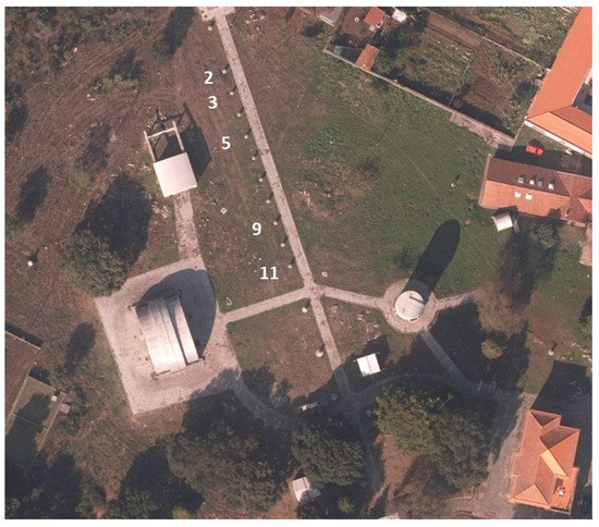 The experimental works, divided into six tests performed in February, March, and November 2021, took place on the facilities of the Astronomical Observatory of the University of Porto (AOUP), using as control points the pillars from a North-South oriented calibration base (Figure 1) with known precise coordinates in ETRS89. The devices used in the experiments were centered at the top of the pillars using a leveling base. The smartphone was positioned so that the GNSS antenna, located in the upper left corner of the screen, was centered over the point. The smartphone available for the experiments was the Xiaomi Mi8 which, at the time of its acquisition, in 2018, was one of the few that allowed access to raw dual frequency data.