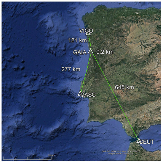 For reference stations, four Continuously Operating Reference Stations (CORS) from the EUREF Permanent GNSS Network [14] were chosen (see Table 1 and Figure 2) in order to have different baseline lengths. Distances vary between 0.2 and 645 km, respectively, for stations Gaia and CEUTA. The GNSS observations from these reference stations were obtained at 1 Hz using the BKG Ntrip Client (BNC) [15] software.