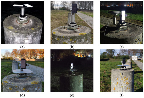 Test 4, held at 4:30 pm on 18 November, had a survey lasting 4 h in pillar 9 (Figure 3d). Test 5 lasted 3 h, starting at 6:30 pm on November 19 in pillar 5 (Figure 3e). Test 6 had a survey time of 5 h, in pillar 11 (Figure 3f), starting at 8:15 am on 22 November. In these last three tests, an aluminum plate was used under the smartphone (Figure 3d–f)) to minimize the multipath effects.