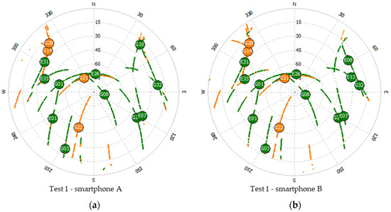 Looking at Table 2, Figure 4a,b and Figure 5a, we see a slight difference in the tracked satellites, and geometry, for the smartphones used during Test 1. For smartphone B we have a better PDOP when we only consider the Galileo satellites, while for smartphone A we see a slightly better PDOP when we consider only the GPS satellites. This can be explained by the differences in the number of satellites shown in Figure 5a, as device B observed more Galileo satellites than device A, whereas in the case of GPS the opposite occurred.