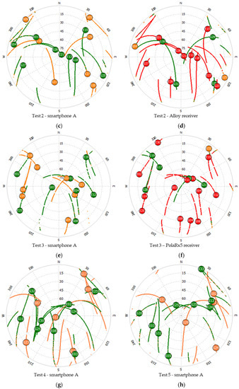 These results are no better than Test 5, despite the longer observation time. This may be due to the smaller number of Galileo satellites tracked by the smartphone, as shown in Figure 5e,f). A drop in the number of Galileo satellites tracked after the first part of the experiment also contributed to this result. Looking at the satellites tracked by the Alloy receiver (see Figure 5f), we notice that the number of Galileo satellites has not decreased as drastically, so the issue is related to the smartphone’s tracking capabilities.