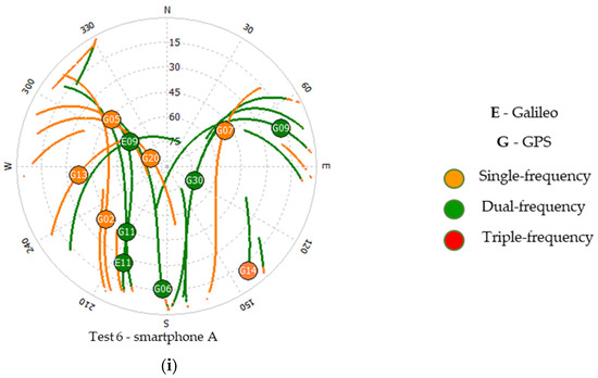 Skyplot: Test 1 smartphone A (a) and smartphone B (b); Test 2 smartphone (c) and Alloy receiver (d); Test 3 smartphone (e) and PolaRx5 receiver (f); Test 4 smartphone (g), Test 5 smartphone (h); Test 6 smartphone (i).