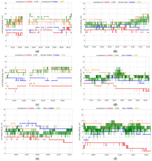From the skyplots in Figure 4a,b, we see that the satellites tracked by the two smartphones are slightly different. When we look at the comparison with geodetic grade receivers, the differences are more noticeable, with the mobile device tracking fewer satellites, as seen in Figure 4c–f. This is most notorious in the case of the Galileo constellation, as we can see in Figure 5 and Table 2.