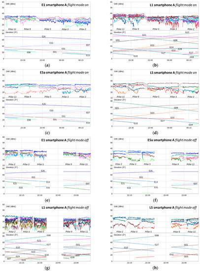 Test 1 SNR smartphone A: E1 flight mode on (a); L1 flight mode off (b); E5a flight mode on (c); L5 flight mode on (d); E1 flight mode off (e); L1 flight mode off (f); E5a flight mode off (g); L5 flight mode off (h).