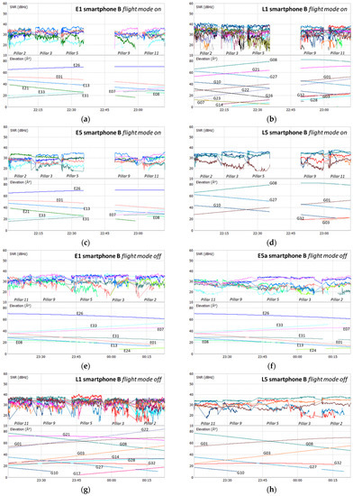 Test 1 SNR smartphone B: E1 flight mode on (a); L1 flight mode off (b); E5a flight mode on (c); L5 flight mode on (d); E1 flight mode off (e); L1 flight mode off (f); E5a flight mode off (g); L5 flight mode off (h).