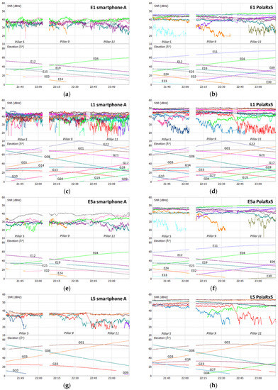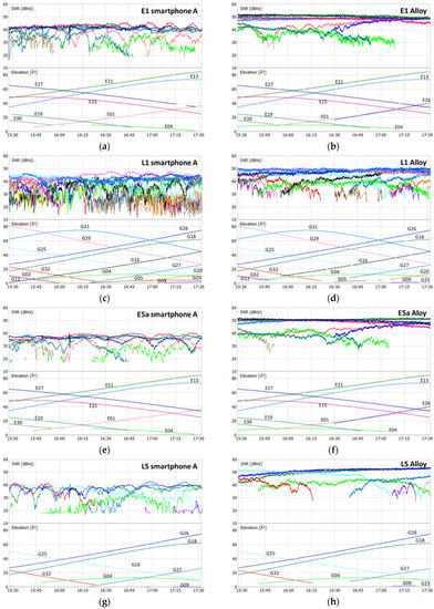 Test 3 SNR: E1 smartphone (a) and receiver (b); L1 smartphone (c) and receiver (d); E5a smartphone (e) and receiver (f); L5 smartphone (g) and receiver (h).