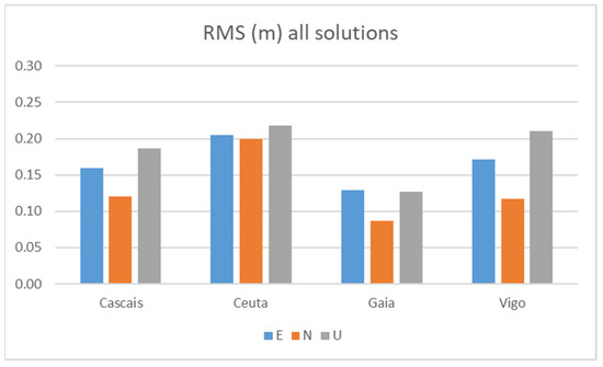 From Table 7, we see RMS values between 20 and 22 cm in the three components for the more distant station CEUT (645 km), which is very interesting and promising for this level of equipment used in the rapid survey (10 min of observation). The other two long baselines VIGO (121 km) and CASC (277 km) have practically all values below 20 cm, with components E and N tending to have values around 15 cm. As expected, the best results were obtained using GAIA, a very small baseline, with the N component below 10 cm and the other two components between 12 and 13 cm. In fact, it was expected that even better values could be achieved with this GAIA station, but previous work experience with a fast survey (<10 min) has shown values of this level. This seems to be a usual accuracy for a quick survey using a smartphone, with the results being close to those obtained in the other tests (Figure 14, Figure 15, Figure 16, Figure 17 and Figure 18).