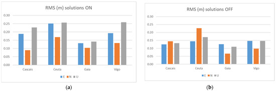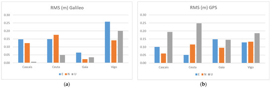 RMS results for the Galileo-only (a) and GPS-only (b) solutions at Test 1.