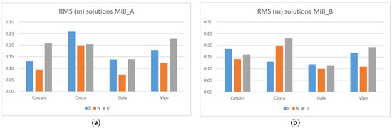 RMS Galileo + GPS solutions from the two Mi8 at Test 1: Mi_A (a) and Mi8_B (b).