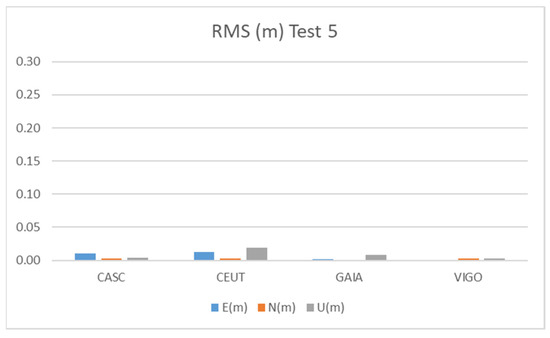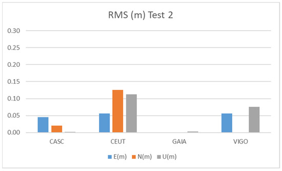 The results of Test 2 show a better behavior than those obtained for Test 1, due to the longer duration of observations (2 h), as we see in Tests 4, 5, and 6, also with a long time of observation, to be presented later. The CEUT station shows RMS values below 15 cm, while the CASC and VIGO stations show values below 10 cm and GAIA, the shortest baseline, below 1 cm.