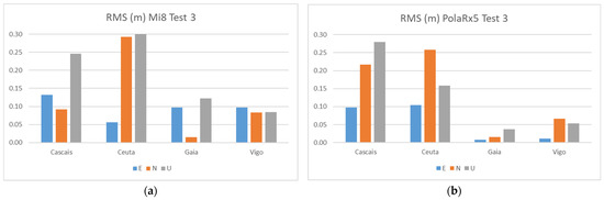 RMS results for Galileo + GPS combination using the smartphone (a) and Septentrio PolaRx5 (b) at Test 3.