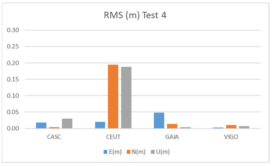 Test 4 results show values at the level of the other tests, very similar to Test 2. The CEUT station shows RMS values below 20 cm, while the other three stations show values below 5 cm.