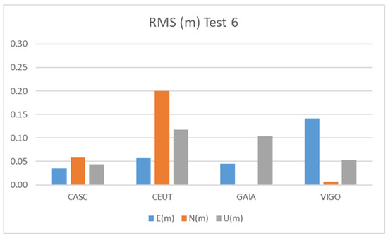 The Test 6 results show accuracies similar to those obtained in the other tests, with values below 20 cm for the CEUT station, while using the other CORS stations we obtained accuracies below 10 cm for most components.