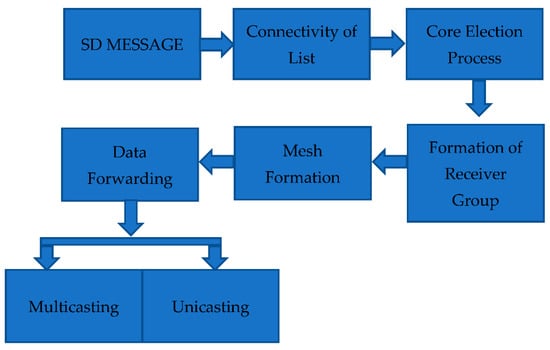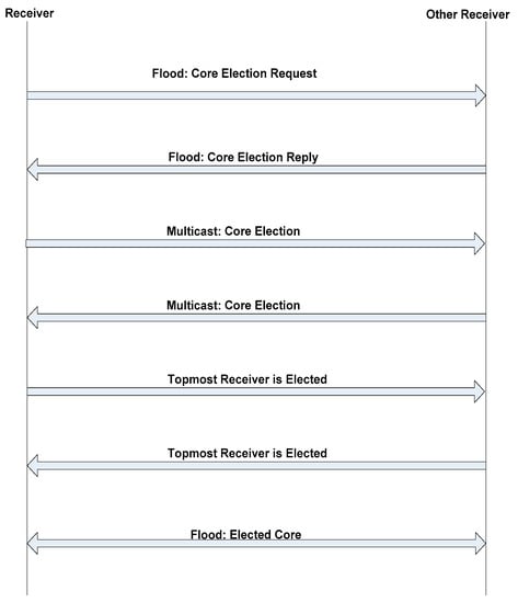 In core election process, nodes “n” is equally distributed using random topology with the velocity of 0-Vmax. Initially two conditions occur. First, if n wishes to become a member of the already existed group, then it will join the group having their own core node because the existed core node was continuously broadcasting the SD messages within the receiver group. The SD messages are further broadcasted by the group member to reach to every node within the vicinity of the group. These messages are received to node n through any group member m. Hence, node n joins the group as defined in the SD message and actively participating tin the group. Secondly, in the absence of the receiver group, the node n will declare himself as a core node and broadcasting the SD message as a core node to inform others node to join the group. After formation of the receiver group, the formation of the mesh is started as shown in Section 5.