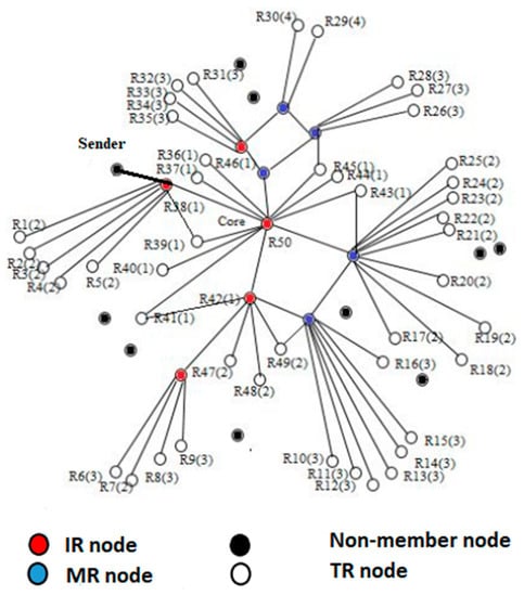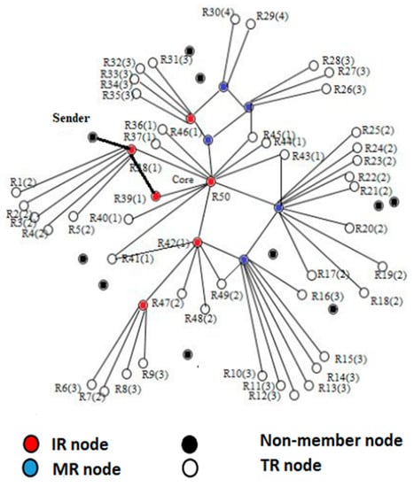 The nodes in the network are characterized as non-group (NM) members and group members. The former is not part of the mesh and represented in a black dot, as shown in Figure 3. The latter is divided into mesh relay (MR), intermediate receiver (IR) and terminal receiver (TR). The MR is the intermediate node between the core and a receiver and represented as a blue color. The TR is known as a terminal receiver, and the mesh finish on it, TR does not contribute to the packet forwarding and is represented in white color. Likewise, the IR acts as an intermediate node and a receiver and are represented as a red dot. The intermediate node between R48 and the core node is R42 node. At the start of the communication, only receivers are mesh members, but later on, the MR will also be a part of the mesh member because they occur between the TR and core node and communicate the data. In the PUMA and CAMP, the data are transmitted through flooding within the group. When the data are transmitted from a source to any mesh member, it is flooded immediately inside the mesh. As a result, the desired receiver within the group receives the data through flooding. The packet received twice by any group member will be rejected because the information about the repeated packet is already saved in the cache, which will further waste the resources of the group member. In Figure 3, R50 is the parent node of R38. The affiliation of the parent to child remains until it reaches the group member R38. When it reaches R38, then it immediately floods within the mesh of a group. Moreover, if the number of group members increases, then flooding is further worsening the performance.