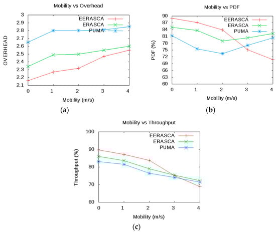 In Scenario 1, the mobility varies from 0–4 m/s, and all other parameters are fixed, as shown in Table 2. Based on these parameters, several results are obtained from ERASCA and PUMA, and a comparison is made with the EERASCA. As shown in Figure 9a, when the mobility is low, then EERASCA transfers 90% packets, whereas the packet transfer rate of ERASCA and PUMA are 86% and 82% consecutively. As the mobility increases, then the PDF drops due to frequent topology changes. In high mobility, the packet drops increase; this decreases the PDF with the increase in overhead, as shown in Figure 9b. The high mobility increases the overhead and link failures, and hence the retransmission of packets increases. This retransmission of packet increases the flooding and hence decreases PUMA and ERASCA in terms of overhead. In Figure 9c, throughput decreases due to an increase in overhead.