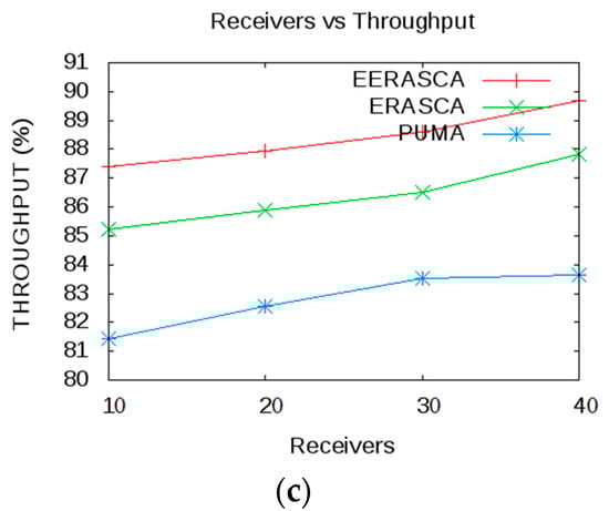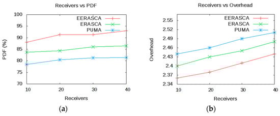 Figure 10 shows that by increasing the receivers then the performance of overhead, PDF and throughput are improving in EERASCA as compared to PUMA and ERASCA. Figure 10a,b shows that the increase in PDF and throughput is due to the presence of many alternate paths between the receivers and the group members which minimizes the packet loss as compared to longer and fewer paths. Packet loss is caused due to data transmission error and congestion. Packet loss arises when one or more data packets are moving across a network fail to reach the desired destination. Hence, as the number of receiver’s increases, then there will be richer connectivity between the nodes in the group and increases the PDF and throughput.