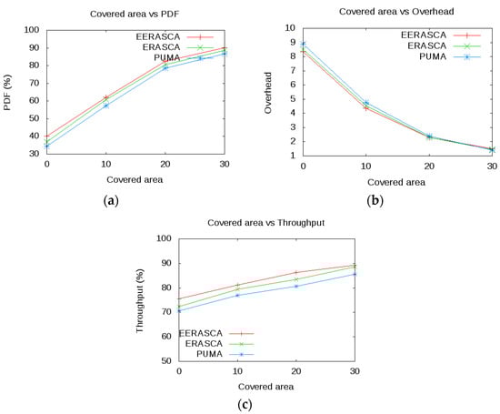 Figure 11 shows the PDF, throughput and overhead vs covered area. In 30 × 30 m2 terrain dimension with PUMA, ERASCA and EERASCA protocol, EERASCA demonstrates superiority over PUMA, ERASCA within a small, covered area because of the fewer possibilities of packet drop due to link failure. Hence, throughput and packet delivery fraction improve and overhead depreciates. In contrast, with the increase in the covered area, throughput and packet delivery fraction decrease, but its graph is still higher than the PUMA and ERASCA, as shown in Figure 11a,b. The performance further deteriorates when flooding is used. EERASCA shows improved PDF, overhead, and throughput in 11c than PUMA and ERASCA because both PUMA and ERASCA flooding are used. In EERASCA, multicasting is used in a large, covered area, and unicasting is used in a small covered area with a smaller number of nodes. The confidence interval for PDF, overhead and throughput is shown in Table 5 in the presence of covered area (0–30 m2), which shows the mean value, highest and lowest value.