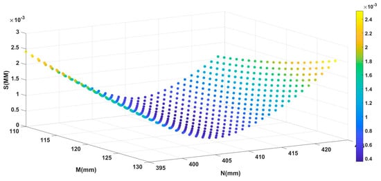 According to the self-rotating, LSL scanning, 3D reconstruction system designed in Section 2, it was preliminarily estimated that the M value would be in the interval (110, 130), and the N value would be in the interval (395, 425). Using the calibration method described in Section 3 to process the collected data, the relationship between the parameters M, N, and the root-mean-squared error S was obtained, as shown in Figure 6. The position parameters Mopt and Nopt corresponding to the minimum root-mean-squared error were the calibration results of the parameters M and N, as shown in Table 1.