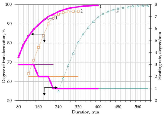 In order to increase productivity and the degree of chemical transformation, it was proposed to perform heating stepwise; i.e., at the initial stage, heat at a speed of 3 degrees per minute, after which the heating speed was reduced to 2 degrees per minute, and at the final stage, the speed was reduced to 1 degree per minute. Heating modes were identified in