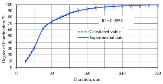 The method of variable heating at different stages (in accordance to reduce the time for the process) was also tested. Analysis of the results shows that the degree of correlation between the theoretical and experimental curves is 98.55%, which indicates that our assumptions are correct. According to the obtained kinetic curve, the activation energy (8461.7 kJ/mol) was determined, and the change in the limiting stage from vaporization to internal diffusion was also established. Thus, based on the results of research on optimizing low-temperature fluorination, the following technological parameters for obtaining NdF3 can be proposed: