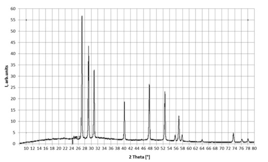 For elemental analysis, the sample was placed in a metal holder with a plastic centering ring. The samples were analyzed in a vacuum. The standardless analysis was carried out according to the program developed for the software Uniquant. The standard Kappa list “AnySample” was used for the calculation, and the calculation was carried out under the assumption of an oxide matrix. The total analysis time of one sample was 18 min, while measurement takes place on 126 analytical lines. Qualitative phase analysis was performed using the ICDD PDF-2 database and the CrystallographicaSearch-Match software package.