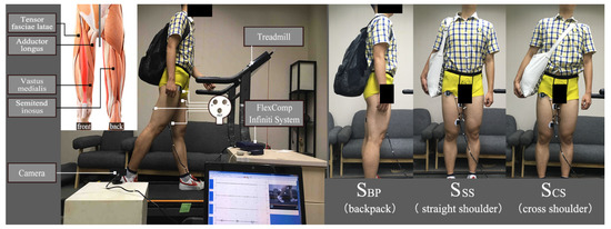 The experimental equipment and connection, the placement of the electrodes, and load styles (SBP = backpack, SCS = cross shoulder, and SSS = straight shoulder).