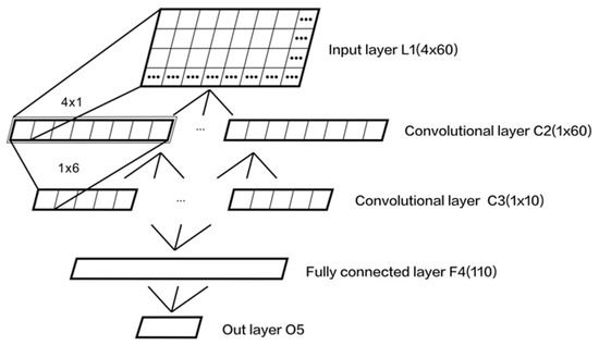 In this paper, a one-dimensional convolution operation was used, and the neurons were defined as (l, m, r, and f), in which l was the layer, m was the feature image, r was the specific position of neurons in the feature image, and f was the activation function. The input and out of a neuron were recorded as and , and . In C2 and C3, we employed f (u) = tanh ( u) as the activation function (where = 1.7159 and = 2/3 [40]). In F4 and O5, we used the sigmoid function ) as the activation function. Each layer is expressed in detail as follows: