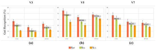 For comparison, we adopted an SVM and BPNN to process the same data. The gait recognition performance of the three algorithms is presented in Figure 3. Under the three speeds, the average gait recognition performance of the three load styles from the CNN was the best (84.83% at V3, 93.40% at V5, and 90.10% at V7). Furthermore, the performance of gait recognition from the SVM and BPNN indicated the same tendency: the performance from SBP was better than that from SSS, and the performance of SCS was the worst among the three algorithms under each speed for all experiments. UNIANOVA showed the same conclusion: the different load styles also had significant effects on gait recognition, as obtained from SVM and BPNN (SVM: p < 0.05; BPNN: p < 0.05).