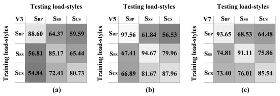 Three different CNN models were constructed at each speed, which were trained by the data from one of the three load styles, and the test data were from all three load styles evaluated one by one at the same speed. All the performances are presented in Figure 4. Every value in those matrices represented gait recognition performance among all subjects according to the designated training load styles (vertical axis) and testing load styles (horizontal axis). The values on the main diagonal were obtained when the training and testing data were from the same load styles (intra-load styles), and the other off-main diagonal values were obtained when the training and testing data were from different load styles (inter-load styles). Then, a t-test indicated that there was a marked difference (p < 0.05) between the values on and off the main diagonal, which means that load styles had a significant effect on gait recognition. For example, when the testing data were from SBP and the training data were from SBP, SCS, and SSS under V5, the gait recognition performances (97.56%, 66.89%, and 67.41%, respectively) were markedly different. A similar phenomenon was also found in other experiments. Among all the experiments, the best and poorest performances at V3 appeared when the training data came from SBP and SCS and the testing data came from SBP (SBP–SBP: 88.60%; SCS–SBP: 54.84%). For V5 and V7, the best and poorest performances appeared when the training data came from SBP and the testing data came from SBP and SCS (SBP–SBP: 97.56% at V5 and 93.65% at V7; SBP–SCS: 56.53% at V5 and 64.48% at V7).