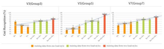 At each speed, all the data from the three load styles were mixed as the testing data group (group 3 (V3), group 5 (V5), and group 7 (V7)), and the training data were mixed as one or several load styles. This means that there were seven different combinations of load styles in the training data at each speed: one load style in the training data (three kinds), two load styles in the training data (three kinds), and three load styles in the training data (one kind). The performances are summarized in Figure 5, which shows that the poorest performance occurred when the training set included one load style (71.90% at V3, 63.80% at V5, and 74.78% at V7), while the performance was much better when the training set included two load styles (80.08% at V3, 80.33% at V5, and 83.59% at V7); the best performance occurred when the training set included three load styles (86.96% at V3, 96.69% at V5, and 90.44% at V7). The trend lines (linear prediction) intuitively display the marked impact of the kinds of load styles included in the training data on gait recognition.