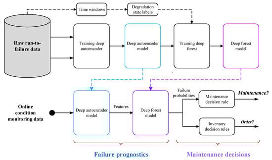 In this paper, a deep auto-encoder and deep forest-assisted failure prognosis method was proposed for dynamic predictive maintenance scheduling (DPMS). The representative features reflecting system degradation were extracted from raw sensor data by using a deep auto-encoder, while the inclusion of the deep auto-encoder allowed the nonlinear relationship between the representative features and discrete degradation states to be learned. The integration of these two models led to an effective failure prognosis model. With the prognostic failure probabilities, the maintenance and inventory activities are scheduled through quickly evaluating the costs of different decisions. The verification results using NASA’s open datasets of aircraft engines reveal the feasibility of the proposed DPMS method. According to the prognostic accuracies and average maintenance cost rates, the proposed method is better than several state-of-the-art methods. Future work will focus on the investigation of predictive maintenance strategy for more sophisticated systems with multiple components.