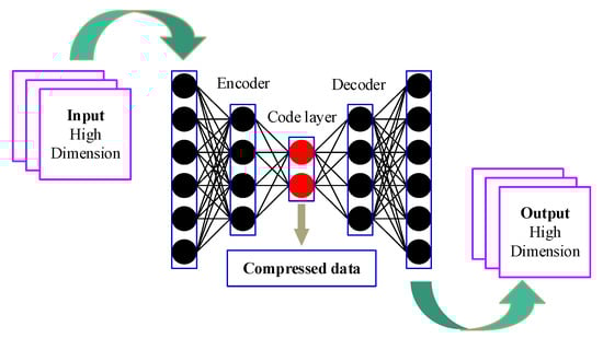 Auto-encoder technology is an important branch of deep learning theory and can be regarded as a feature extraction method of isodimensional mapping [21]. A basic auto-encoder consists of two main parts: an encoder and a decoder. The function of the encoder is to encode the high-dimensional input into a low-dimensional implicit variable (), so as to force the neural network to learn the most informative features. The function of the decoder is to restore the hidden variable of the code layer to the initial dimension. The best state is that the output of the decoder can perfectly or approximately restore the original input , i.e., . Therefore, the implicit variable can be considered as the representative feature reflecting system degradation.