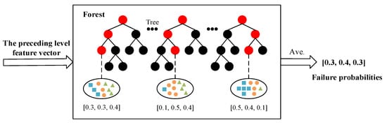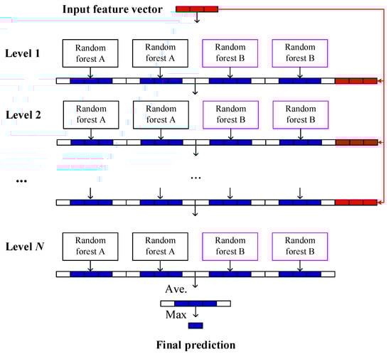 To capture the nonlinear relationship between the representative features and discrete degradation states, an integrated learning method called deep forest [22] is employed. One of the main advantages of the deep forest is the ability to handle unbalanced observation data. As mentioned in Section 2.1, the degradation process of a system can be divided into three discrete states (Deg1, Deg2, and Deg3) according to its RUL. Considering that the system operates under normal conditions most of the time, the amount of data of Deg1 will be significantly more than those of Deg2 and Deg3. Therefore, when applying the deep forest for system failure prognosis, it can improve the prognostic accuracy by handling the unbalanced observation data.