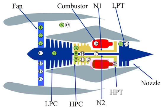 The C-MAPSS dataset is a popular dataset simulating various scenarios of aircraft engine degradation and has been widely used to test the performance of various data-driven failure prognosis methods [28,29,30,31,32]. Figure 5 shows the schematic diagram of the simulated engine. It is composed of several main components, such as a fan, low-pressure compressor (LPC), combustor, high-pressure compressor (HPC), low pressure turbine (LPT), high pressure turbine (HPT), and nozzle. In the initial phase of each scenario, the engine operated normally. As the service time increased, its performance degraded gradually, and the complete run-to-failure data have been recorded in the “train-FD001.txt” subset. In this paper, to determine the structure of deep forest and test the decision accuracy of the engine at different inspection moments, the “train-FD001.txt” subset including 100 trajectories will be divided into three parts. The first part consisting of the first 70 trajectories is used to train the proposed feature extraction model and failure prognosis model. The second part that contains the next 10 trajectories is used as the verification set to estimate the training results, and the deep forest structure will be preserved when the classification accuracy is greater than 90%. The third part including the remaining 20 trajectories is used as the test set for simulating the real-time condition monitoring processes.