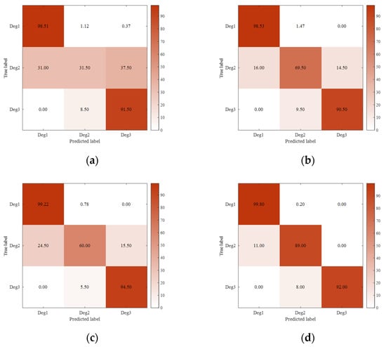 Then, the 12 dimensional degradation features extracted from the deep auto-encoder are fed into the deep forest for training. During the training process, if it is found that the prognostic accuracy within 10 running cycles is not improved, the training will stop. Figure 6 presents the average confusion matrices of different prognostic models on the test engines with three respective classes: Deg1 (), Deg2 (), and Deg3 (). From this figure, no matter which kind of prognostic model (“LSTM network” [24], “Bi-LSTM network” [34], “deep forest” [35], or “deep auto-encoder + deep forest”) is used, the prognostic accuracy for Deg1 is the highest. This can be explained as Deg1 refers to the low degradation, and accordingly there are more training data. Regarding Deg2, the use of the integrated model of a deep auto-encoder and deep forest allows improving the prognostic accuracy. This is mainly because the deep auto-encoder can extract the representative features of engine degradation, while the deep forest can handle the uneven classification sample data. As for Deg3, each model can obtain a prognostic accuracy of more than 90%. Actually, the high prognostic accuracy at this stage is very important for improving the flight safety of the aircraft. In summary, the prognostic model of this paper outperforms the LSTM network, Bi-LSTM network, and single deep forest model.
