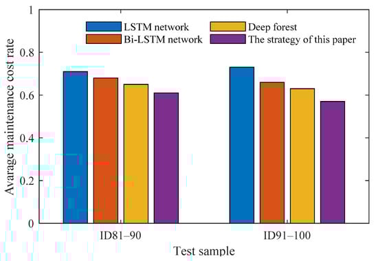 Next, the average maintenance cost rates will be used to evaluate the performances of maintenance strategies using different failure prognosis methods, as shown in Figure 7. In this figure, the 20 test engines (ID from 81 to 100) are equally divided into two groups. It is observed that, regardless of the group, the use of deep forest can reduce the average maintenance cost rate of the engines. Further, the inclusion of the deep auto-encoder allows improving the accuracy of decision-making. Accordingly, the strategy of this paper (i.e., “deep auto-encoder + deep forest”-based predictive maintenance) can obtain the lowest maintenance cost rates.