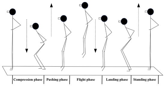 In this paper, vertical jumping was divided into five periods: (1) the compression phase: from upright to the maximum angle of a knee squat; (2) the pushing phase: from the maximum angle of a knee squat to feet off the ground; (3) the flight phase: from feet off the ground to feet on the ground; (4) the landing phase: from feet on the ground to the maximum angle of a knee squat; And (5) the standing phase: from the maximum angle of a knee squat to upright (Figure 2).