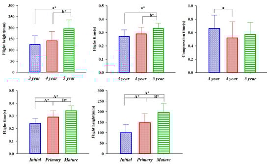 AS shown in Figure 4, flight time and flight height have the main effects of stage and age and tend to increase gradually. Compression time has the main effect of age (p < 0.05).