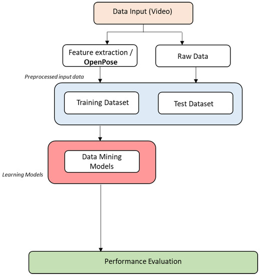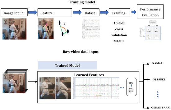 The objective of the research introduced in this paper is to determine if computer vision algorithms (in this case, OpenPose) are useful to identify the movements performed in a Karate kumite by both practitioners. To answer the question, a dataset will be prepared following predefined Kihon Kumite movements both corresponding to attack and defense as explained in Section 4.2. The processing of the dataset consists of two clearly differentiated parts: (i) the training of the classification algorithms of the system using the features extracted with the OpenPose algorithm, and (ii) the application of the system to the input of non-preprocessed movements (raw data). These two stages are broken down into the following sub-stages, as shown in Figure 1: