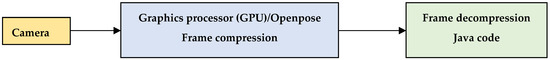 The operation of OpenPose for the application programmed consists of a communication system between OpenPose and the functions designed for the video manipulation, done with the four classes in a Java application listed below. The computational cost associated with the processing is determined through the computational analysis of the following main parts of the code that are represented in Figure 6.