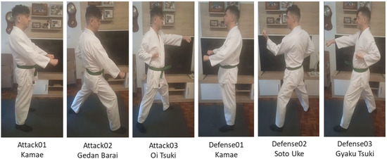 The Ippon Kihon kumite sequence proposed for this study would actually be (i) Gedan Barai, (ii) Oi Tsuki, (iii) Soto Uke, and (iv) Gyaku Tsuki. However, to calibrate the algorithm and enrich the dataset, we also took two postures Kamae (which is the starting posture), both for attack and defense, although they are not properly part of the Ippon Kihon kumite.