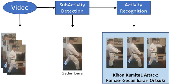 However, currently, hardly any sensor-based or video-based HAR systems address the problem of modeling the movements performed from a psychomotor perspective [43,44], such that they can be compared with the same user along time or with users of different levels of expertise. This would allow to provide personalized guidance to the user to improve the execution of the movements, as proposed in the sensing-modeling-designing-delivering (SMDD) framework described in [45], which can be applied along the lifecycle of technology-based educational systems [46]. In [45], two fundamental challenges are pointed out: (1) modeling psychomotor interaction and (2) providing adequate personalized psychomotor support. One system that follows the SMDD psychomotor framework is KSAS, which uses the inertial sensors from a smartphone to identify wrong movements in a sequence of predefined arm movements in a blocking set of American Kenpo Karate [47]. In turn, and also following the SMDD psychomotor framework, we are developing an intelligent infrastructure called KUMITRON that simultaneously gathers both sensor and video data from two karate practitioners [48,49] to offer expert advice in real time for both practitioners on the Karate combat strategy to follow. KUMITRON can also be used to train motion anticipation performance in Karate practice, based on improving peripheral vision, using computer vision filters [50].