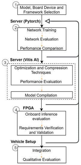 Figure 2 depicts the five-step methodology followed to implement the deep learning-based inference model in the vehicle setup. It includes a literature review for selecting a 3D Object Detection model, an FPGA-based platform (Xilinx Ultrascale + ZCU102) and a compatible framework (Vitis AI). After this step, the 3D object model is subjected to the training and evaluation phase, both performed on the server-side (Intel Core i9 with 64 GB RAM and a Quadro RTX 6000 GPU) to ensure that our model meets the application requirements on the server. In this context, the proposed development flow follows an iterative approach, where the model is updated, and the steps of training and evaluation are repeated whenever required. The KITTI dataset [15] is used for the evaluation of this workflow. When this goal is accomplished, Xilinx tools are used in the deployment phase (3). Here, Vivado and Petalinux are used to configure and build hardware and software components for the selected board. Vitis AI allows the optimization and compression of the model obtained in the previous step. Before mapping model’ operators to instructions for the Intellectual Property (IP) core, called Xilinx Deep Learning Processing Unit (DPU), provided by Xilinx, the performance of the optimized and compressed version of the 3D object detection model is analyzed with regard to accuracy degradation and speed improvement. The process flow only starts the compilation step (3) when an optimal balance between performance metrics is achieved. Otherwise, the development flow restarts in stage (2). As steps in (3) are performed in the server, it only provides insights about the accuracy and trade-off between metrics, the condition criteria for an on-board inference time lower than 100 ms needs further validation. To do so, Vitis AI output files are loaded onto the FPGA-based board for model execution and the inference times are observed. To assess inference time criteria, but with satisfactory accuracy performance, steps (2), (3), and (4) might need to be repeated. A detailed description of the platform generation flow is provided in [35].