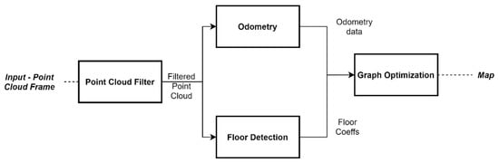 In this work, we propose an architecture for GraphSLAM using the open-source framework ROS [37]. Our proposal is aimed mainly at 3D LiDAR data assembled on cars. In ROS, processes are represented as nodes in a graph structure, connected by topics, which is very convenient for GraphSLAM task. Figure 3 shows the processes flow of the proposed GraphSLAM, where four main processes stand out, namely, Point cloud filter, Odometry, Floor Detection, and Graph Optimization.