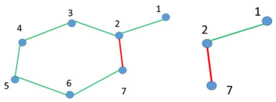 Let Vrem = {3,4,5,6} be the difference between both paths, i.e., removing all elements in P1 present in P2 and Erem = {23,34,45,56} to identify all of the edges formed by vertices Vrem present in E. Thereafter, a pruned graph Gp = {Vp, Ep}, with Vp = {1,2,7} and Ep = {12,27}, is computed by removing the vertexes Vrem and the edges Erem in G, as showcased in Figure 6 (right-hand graph). Due to the advantages brought by the inclusion of the loop-closer function on SLAM as discussed before, we performed a general optimization to the graph whenever a new loop was included.