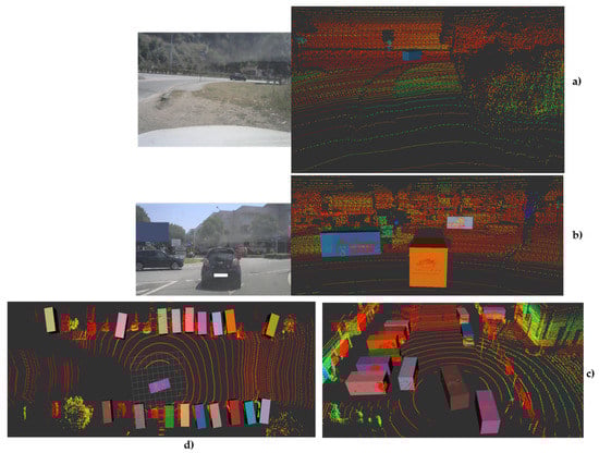 A 3D Object detection output on different scenarios: (a) test vehicle parked and dynamic objects on toad ahead; (b) Highlight of detected objects in typical approach to roundabout; (c) overtake scenario; and (d) Top-down view of a sample of moving test vehicle in a densely occupied area.