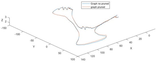 Figure 10 shows the trajectory of the previous figure but with and without the application of the graph pruning. The results of its application can be seen in Table 4. The reported results show an improvement in the efficiency of about over 9.5 s in the graph optimization process between pruned and not pruned graphs. According to Figure 3, the rest of the following processes: Filtered points, Floor detection, and Odometry, consume nearly 16.2 s. The time elapsed when the no-pruned graph is applied is 84.5 s, while the pruned graph process takes 75 s.